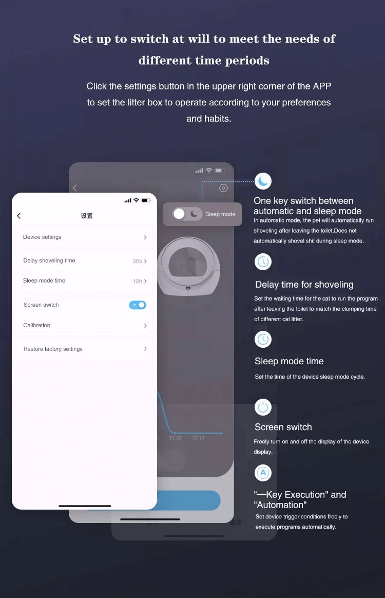 4:app wifi control intelligent self-cleaning for big pet cats toilet fully enclosed smart cat litter box automatic application : cat material : pp polypropylene resin app remote control support tuya intelligence, PET HUHOU support multi-account sharing , gravity sensor, large space, super silent, anti-grit leakage data monitoring : weight, time, number of times infrared monitoring automatic sending reminders odour-cleaning sterilisation low-pedal design easy for short-legged
