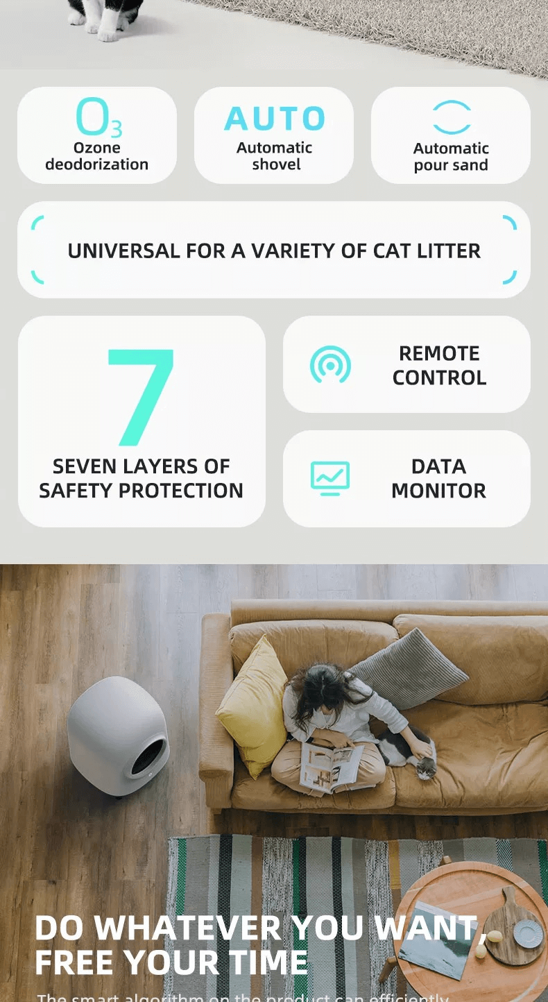 6:APP Tuya remote monitor & control, abnormal notification Microwave radar 360 degree inductionUltraviolet ozone 99% sterilization,AI voice controlUltra-quiet motorData cloud storage Support variou specifications of cat litter