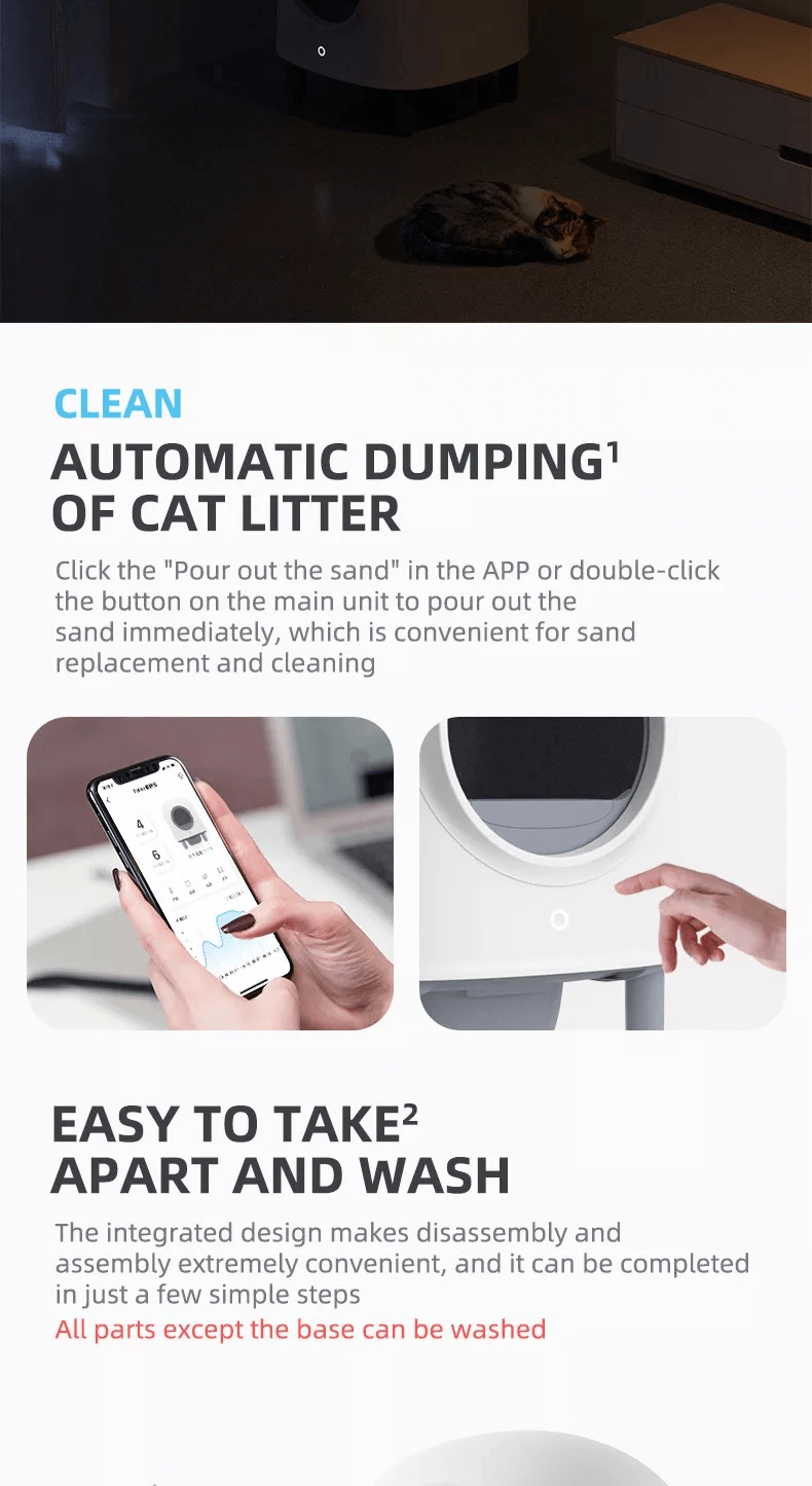 3:100% Safe for Cats: An integrated device of radar, infrared sensor, gravity sensor, anti-pinch infrared sensors, self detection, ventilated and inverted triangle stable structure design, abnormal alert via APP, makes sure that no cats will get hurt.