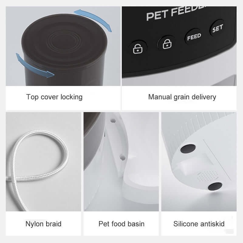 5:Voice Recorder: Stay connected with your pet by calling automatic pet feeder before meals with a 10s voice recording clip, thus enhancing the bond with your pet by keeping it fed regularly and feel safe & well cared.