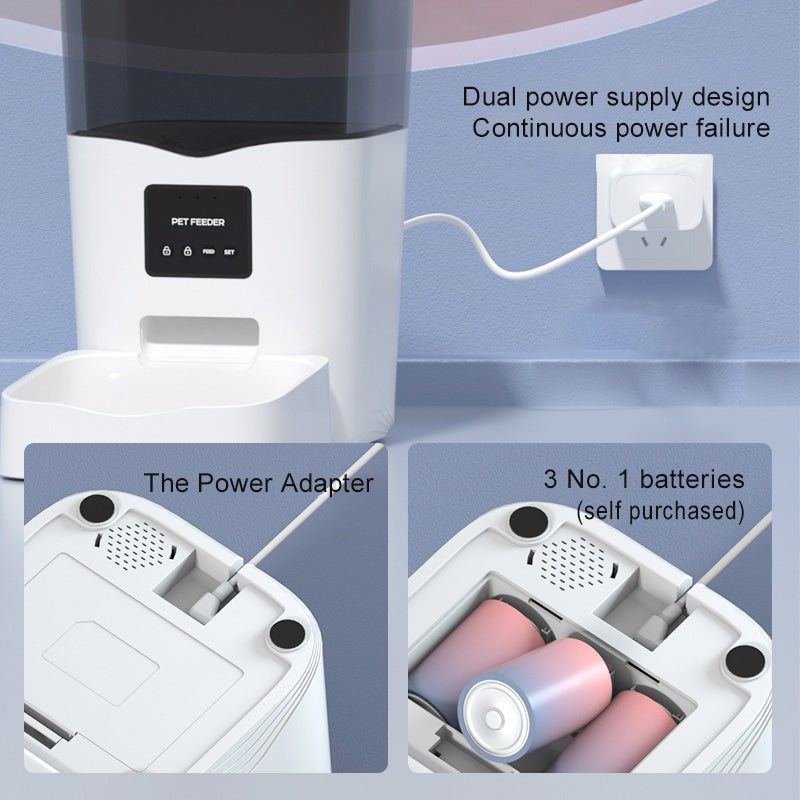 4:Dual Power Supply: Use the 5V DC adapter while sustaining the auto cat feeder power via 3 alkaline D-cell batteries(not included) installed in case of power outages, ensure that your pet gets food consistently. (Equipped with setting memory to prevent sudden power failure)