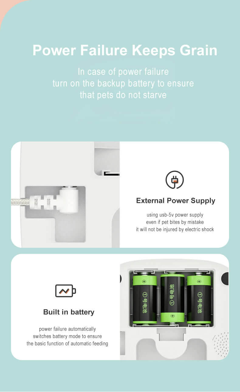 1. This smart feeder feeds your pet when you're away - schedule automatic feedings up to n times a day using the built-in programmable timer. Every meal time can be planned with a few button clicks on the LCD screen. Never miss a feeding. The feeder is wall powered and/or battery powered. In the event of a power outage, the feeder will continue to run on 3 D-size batteries to ensure your pet is fed (battery is not included in the feeder).